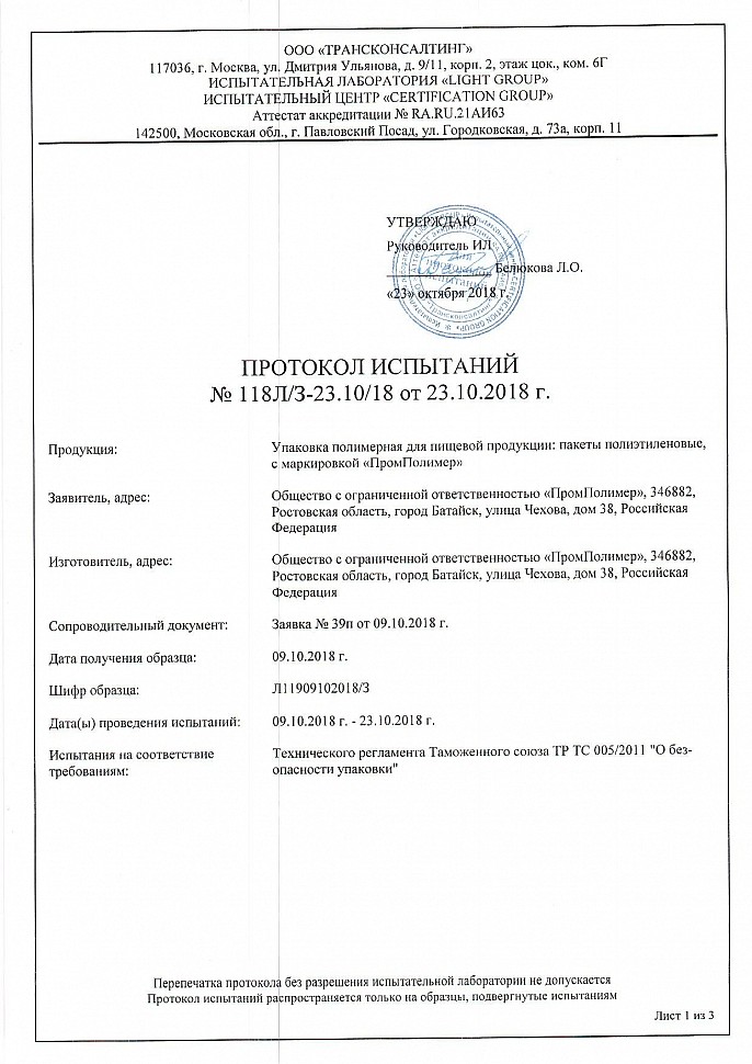 Декларация о соответствии: пакеты полиэтиленовые с протоколом испытаний